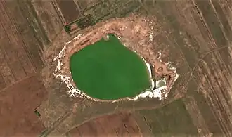 The lake is surrounded by flat steppe landscape, salt pans and cultivated fields. Artemia salina crustaceans live in the lake and are periodically harvested for commercial purposes.[6]