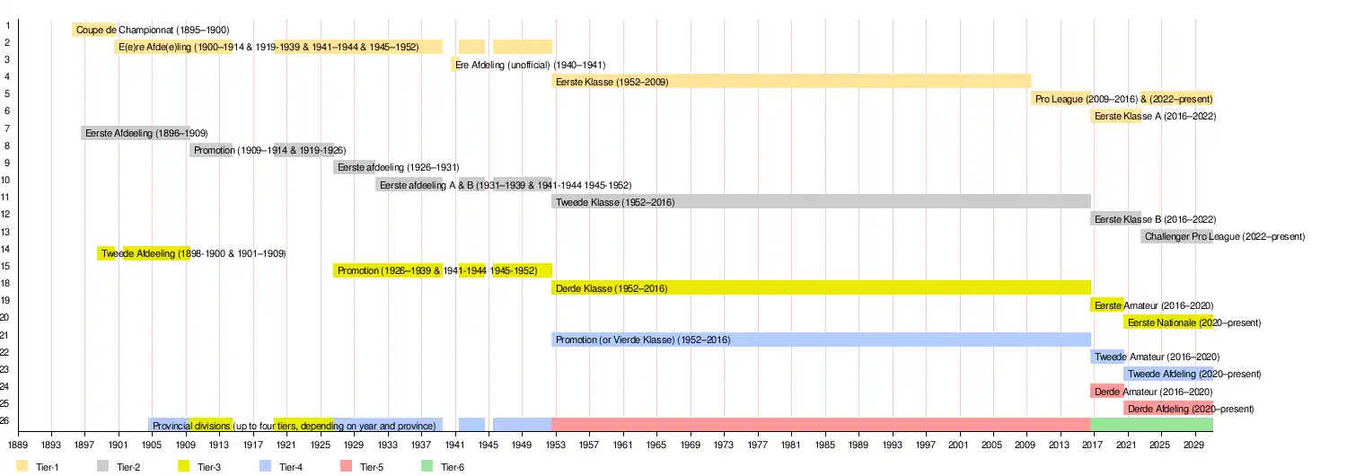 The timeline below lists the evolution of the men's tiers and leagues related to the Belgian FA since 1895. The provincial leagues often span multiple tiers.