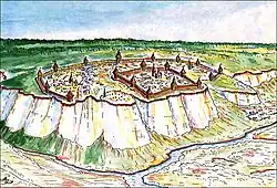 Like many Russian cities, Belgorod began as a fortified settlement. The oldest Belgorod fortress was built at the end of the 16th century on a chalk mountain. According to scientific excavations and surviving archival data, the first fortress outpost was erected in 1596.[20] The site of the construction of the defensive facility was the top of the Belaya Gora ("White Mountain"). This is the highest point of the right bank of the Seversky Donets channel. On 17 September 1650, voivode Vasily Petrovich Golovin laid the foundation for the third Belgorod Fortress on the left bank of the Vezenitsa River, which flows into the Seversky Donets.[21] In the fall of 1650, a wooden fort with 11 towers was attached to the rampart of the Belgorod line, which runs from the fortress town Bolkhovets to the mouth of the Vezelka River in the area of the former brewery. The two parts of the city were connected by the Nikolskaya Passage Tower located in the eastern wall of the Kremlin. The position of the eastern wall of the Kremlin corresponded to the modern street of the 50th anniversary of the Belgorod Oblast. With the expansion of the borders of the Russian state, the military significance of the Belgorod fortress gradually decreased and by the middle of the 18th century, only the Kremlin remained from the formidable fortress.[22]