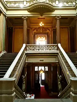 Structural system has vaults and marble columns. Main staircases are three-armed, stone or marble, while side staircases are spiral and iron. The interior walls are plastered and painted, while the representative rooms are decorated with wall paintings and marble imitation and have pilasters with gilded capitals and applied polychrome decorative female masks. The floors have parquet or terrazzo tiles. On the facades decoration was made of artificial stone, while the interior is in stucco and plaster.