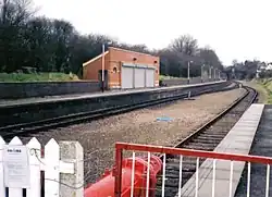 Work commenced on removing the old platform and building the new Leicester North station to the south.[13] On 5 July 1991 the new station was opening by the Rt.Hon. Michael Heseltine MP, flanked by the replica of Stephenson's Rocket and No.35005 Canadian Pacific, each running into its own platform at Leicester North.[7][27] The inclusion of a run-round loop at Leicester North removed the need for push-pull operation between Birstall and Rothley and through services from Loughborough Central could begin. The buffers set into the end of the platform were donated by British Rail and originate from London's Marylebone station, the terminus of the Great Central Railway's London Extension. Due to the lack of station buildings, a carriage was regularly used to act as a ticket office and kiosk.[28]