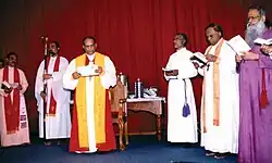The Metropolitan of the BEC was from Malankara Mar Thoma Syrian Church. The Church was founded in 1993 as part of the GFA World (formerly Gospel for Asia) apostolate.[9] On 6 February 2003, K. J. Samuel, the Moderator Bishop of the Church of South India (a part of the worldwide Anglican Communion), along with the P. M. Dhotekar, Bishop of Nagpur of the Church of North India, and Bancha Nidhi Nayak, Bishop of Phulbani of the Church of North India, consecrated K. P. Yohannan as a bishop in Anglican lines of apostolic succession. Bishop John Wilson Gladstone, Mar Aprem Mooken, Metropolitan of the Assyrian Church of the East in India (Chaldean Syrian Church) were also present for the consecration ceremony. K. P. Yohannan thereafter became the first metropolitan of the Believers Eastern Church, and acquired an episcopal polity of ecclesiastical governance.[10][11] He later changed his name to Moran Mor Athanasius Yohan Metropolitan in honor of his beloved patron saints, St. Athanasius, the defender of orthodoxy, and St. John (Yohan) the Apostle & Evangelist [1]. BEC describes itself as being "Apostolic in origin, universal in nature, Biblical and evangelical in faith, ecumenical in outlook".[12] It adheres to the Nicene Creed, biblical faith, and traditions of the historical church backed up with its own canonical constitution.[12] The Episcopal Synod and the diocesan councils take the responsibility for planning and executing the mission, religious life and charitable programs of the Church. The Believers Eastern Church is divided as regions into dioceses, each with its own bishop. Each local church has members ranging from less than one hundred to a thousand with an average of a hundred, and the number of parishes themselves are increasing.[13] The BEC is divided into various dioceses under the leadership of a diocesan bishop or a vicar-general.
