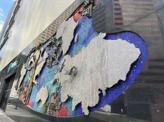 Bell Communications Around the Globe is a 1961 sculptural relief by Anthony Heinsbergen, installed on the west side of an AT&T switching center at 420 South Grand Avenue in Los Angeles, California.[1][2][3] According to the Los Angeles Times, the mural depicts the "globe linked by undersea telephone cables and satellite relays that ricochet off a fey male nude". The map shows North and South America, Europe, Africa, and Australia.[4]