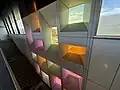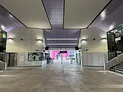 There is one main station building, opened in 2022, and made out of local roofscapes abstracted into three-dimensional patterns: mostly pink and purple glazing windows, post-war rooftops and references to the local art and culture scene.[9][12] It contains a waiting room, a customer service, PSO office and a spacious ground level concourse connected to the platforms.[13][14][15]