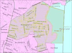 Belle Haven is a census-designated place (CDP) in Fairfax County, Virginia, United States. Nearby CDPs are Huntington (northwest), Groveton (southwest) and Fort Hunt (south). The population of Belle Haven was 6,851 at the 2020 census.[1]