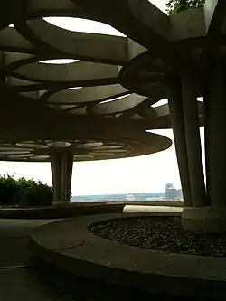An example of organic architecture, the park's pavilion was designed by architect R. Carl Freund in 1955 to serve as an outdoor dancing venue. It features a cantilever roof, bandstand and three pergolas that form the pavilion's signature concrete canopy. Located on the former site of the Bellevue House and incline, part of Cincinnati's historic streetcar system, the pavilion leads to the Daniel J. Ransohoff Overlook of Cincinnati.[2]