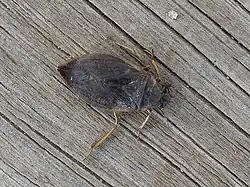 Belostoma flumineum is a North American species of giant water bug (family Belostomatidae). They are a common predator in ponds and wetlands. They are relatively large, reaching 2–2.5 cm (0.79–0.98 in) in length. As with other species of the Belostomatidae family, the fathers take care of the offspring.[1] Exclusive paternal care has been the focus of many studies done on this species. Other studies have been done on food webs and predation pressure using this species because they are an apex predator (among invertebrates) in their preferred habitats.