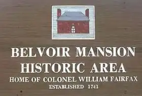 Belvoir was the plantation and estate of colonial Virginia's prominent William Fairfax family. Operated with the forced labor of enslaved people,[3][4] it was located on the west bank of the Potomac River on the present site of Fort Belvoir in Fairfax County, Virginia.