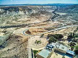 The burial square is surrounded by stepped rock slabs that are also seats for the audience as well as a low stone fence on the southern edge. It looks south to the deep channel of Nahal Tzin and the desert landscape beyond it.