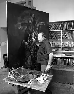 Stahl painted a series of fifteen paintings in the 1950s, commissioned by the Catholic Press. Modeled after the fourteen Stations of the Cross with a fifteenth titled Resurrection, because he wanted the series to end positively, each oil painting was six feet by nine feet (1.8 × 2.7 m).[3]