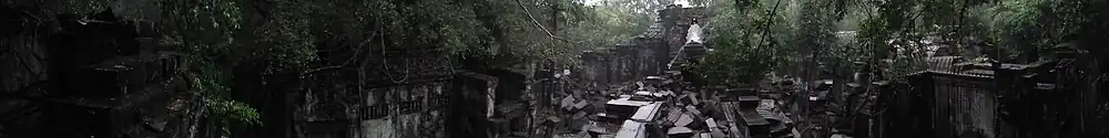 It was built mostly of sandstone: Beng Mealea is only 7 km far from the angkorian sandstone quarries of Phnom Kulen, as the crow flies. Presumably sandstone blocks used for Angkor were transported along artificial water canals and passed from here.[1] Despite lack of information, the quality of architecture and decorations has drawn the attention of French scholars just from its discovery.[4][5][6]