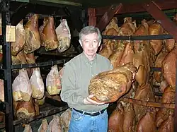 The company uses a slow curing process using salt, brown sugar, and sodium nitrite.[9][10][11] The mixture is rubbed onto fresh hams in a maple box; the hams are then aged an average of 9 to 10 months, but often up to 18 months. Many of the hams are also smoked in a small, wood-fired smokehouse that sits behind the shop. Benton's also produces prosciutto, cured bacon, and fresh pork sausage.[12]