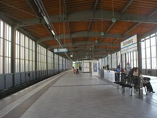 Berlin-Schöneberg (in German Bahnhof Berlin-Schöneberg) is a railway station in the district of Schöneberg, in the city of Berlin, Germany. It is a two-level exchange station serving the Wannseebahn suburban and the Ringbahn circular lines of the Berlin S-Bahn, with the lower level serving the Wannseebahn and the upper level the Ringbahn. The station lies just south of the Dominicusstraße and Sachsendamm streets, where local bus stops allow changing between S-Bahn and busses.