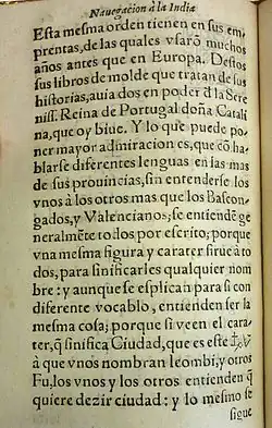 - ^ João Soares,Bispo de Coimbra (ed. com.), [2] Cartas que os padres e irmáos da Companhia de Jesus,que andao nos Reynos de Iapáo escreueráo aos da mesma Companhia da India,e Europa,des do anno de.1549 ate o de.66. Nellas se conta o principio,socesso,e bódade da Christádade daquellas partes,e varios costumes,e idolatrias da gentilitade. Impressas por mandado do Illustris. e Reuerendiss. Senhor dom Joáo Soarez,Bispo de Coimbra,Conde de Arganil.&c. Foráo vistas por sua Senhoria Reuerendissima,e impressas com sua licenca.e dos Inquisidores. Em Coimbra em casa de Antonio de Maris, Anno de .1570. This page has links to the actual publication, and reference to the research paper that discusses its priority: Oskar Nachod, "Die ersten Kenntnisse chinesischer Schriftzeichen im Abendlande". In: Hirth Anniversary Volume. Asia Major, Introductory Volume (Leipzig,n.d. [1923]), pp. 235-273, especially p. 239 f. Lach 1965, p. 679 concurs with this view. The letter in question is one sent from Japan by the Jesuit Balthasar Gago, dated 23 September 1555; the actual page with the six Japanese characters is 106 verso, and the same words in hiragana follow on the next page: [3] Archived 2011-08-19 at the Wayback Machine folio 106 verso and 107 recto