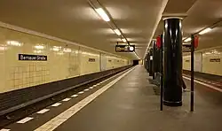 After the Second World War, the subway station was below the border between the Soviet and French sectors. As a result, the building of the Wall on 13 August 1961 closed the station, making it, like five other stations along the line, a "Geisterbahnhof (Ghost Station)" where trains passed through. An opening came only with the political turnaround, at which on 12 April 1990, initially the western part was made accessible again. The entrance gate was removed on 19 March 1990 on the decision to open the station. The bullet-riddled holes in the U-Bahn station were later removed. The eastern exit had to be renovated and was reopened on 1 July 1990.[1]