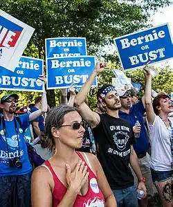 The first night of the Democratic National Convention was frequently disrupted with booing and chanting by a segment of Sanders's campaign workers termed the "Bernie or Bust" contingent. Even Sanders was booed when he said, "We must vote for Hillary Clinton."[146][147] The comedian Sarah Silverman, who had campaigned for Sanders but pledged support for Clinton at the convention, said, "Can I just say: To the 'Bernie or Bust' people, you're being ridiculous."[148] A July 25 report by the Pew Research Center tracing Democratic voters' support for candidates from March 2015 to June 2016 indicated that 90% of Democratic voters who had consistently supported Sanders said they would support Clinton in the general election.[147]
