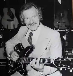 He joined the BBC Show Band directed by Cyril Stapleton in the 1950s, when he began to be featured as a soloist.[5] He also worked as a session musician on many early British rock and roll and other records for artists such as Marty Wilde, Tommy Steele, Billy Fury, Adam Faith and Kenny Lynch, and worked as an accompanist to visiting American singers such as Frank Sinatra, Judy Garland and Nat King Cole. It is estimated that he performed on over 5,000 BBC Radio broadcasts.[3] He was also seen regularly on British television in the 1950s, including some of the most popular children's television programmes.[3] In 1959 he was asked by Top Rank Records to make a record as a solo guitarist.[5] He became the first British guitarist in the UK singles chart, with "Guitar Boogie Shuffle" in 1959,[6] and was cited as an influence by many stars, including Eric Clapton, Brian May, Paul McCartney, George Harrison, John Lennon, Pete Townshend, Keith Richards, Sting, Hank Marvin, Robert Smith, Mike Oldfield, Mark Knopfler and Jimmy Page.[1][2][3]