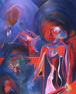 Golahny's early paintings feature a darker palette and rougher line than her later paintings. Much of her early work, such as Street Car Scene, reflects city life in Detroit, New York City, and Chicago: people on buses or trains, workers in factories, and children at play. She blended the abstract and the figurative, often in a given work. Portraiture, including self-portraiture, was a lifelong interest, even as she explored the role of the individual in history and in the cosmos. One series of works, begun around 1964 with a multi-block color woodcut, was titled Landscape of Man in Nuclear Age.[16] The series continued in intaglio, painting, wood engraving, and copper engraving, and was completed in 1988. Golahny repeatedly portrayed human suffering, as in a series of works on the Holocaust.