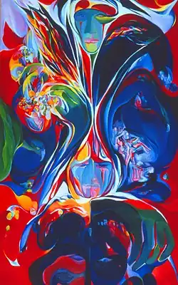 Inspired by publications on nebulae and black holes, Golahny began the Space series in 1980. In dozens of paintings she modeled her images on photographs of cosmic exploration in the archives of the Harvard College Observatory. She also painted evocative layerings of an imagined passage through space and time, and fantastic semi-formed creatures.[17] Art historian Alicia Faxon wrote of one of Golahny's paintings of the Crab Nebula, "Golahny's Crab Nebula . . . capture[s] the process of creation, a process that takes place both in the creation of the nebula and in the gestation of the painting itself. . . . In comparing Crab Nebula to the photographs that inspired the work, it is fascinating to see how much more vivid and complex the artist's interpretation is. The photographs appear static; the painting pulses with energy, embodying an endless universe in creation."[18]