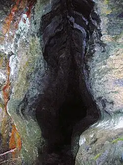 An interesting associated aspect of Bessie Dunlop's story is that the extensive limestone Cleeves Cove site, one of Ayrshire's greatest natural history sites, lies on the Dusk Water only a few miles from Lynn Glen and Monkcastle. As the barony officer to the Blair, Thomas Reid would have known this area well. Tradition records that the caves were the "Elfhame o'the Blair" or the 'Elfhouse'[33] and the locals at that time believed that these magical creatures had made this their abode within the many chamber containing stalactites and stalagmites.[34] At Halloween it was said they would come riding out of the caves on horses that were the size of mice, their long yellow hair straming or tied in knots with crimps of gold. Their quaichs were acorn cups and they drank wine beneath the toadstools. Their clothes were green velvet and their arrows were made of moss-reed tipped with flint arrow heads that were dipped in hemlock poison. The bows were made from the rib bones of unbaptised babies who had been secretly buried in the shaws and glens.[35] It is not known how old these 'Elfhame' traditions are, however excavation shows that it was dwelt in by man and was used by Covenanters seeking a hiding place from the king's troops.