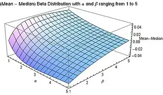When α, β ≥ 1, the relative error (the absolute error divided by the median) in this approximation is less than 4% and for both α ≥ 2 and β ≥ 2 it is less than 1%. The absolute error divided by the difference between the mean and the mode is similarly small: