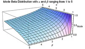 for α, β > 1 Any value in the domain for α = β = 1 No mode if α<1 or β<1. Density diverges at 0 for α ≤ 1, and at 1 if β ≤ 1 | ||