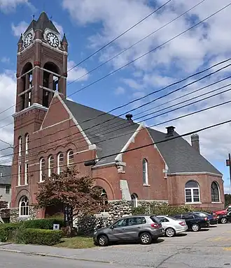 The church is located on the north side of Maple Street, just west of its junction with Moody Street. Maple Street is a major east-west route through Waltham's South Side, and Moody Street is its economic spine. The church is built principally of brick, but the lower half of the ground floor is fashioned out of uncoursed fieldstone. The gabled roof is oriented north-south, with a tall tower at the southwest corner, that has an open belfry topped by a pyramidal roof with gable-topped clock faces. The main entrance is housed inside a large round-arch opening at the base of the gabled section, and has two board-and-batten doors flanked by Romanesque windows with simple tracery.[2]