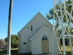 The original timber bell tower is positioned opposite the entry doors to the church. The Beenleigh railway line runs adjacent to the property and a timber footbridge allows pedestrian access across this line. Several graves established prior to the railway line still exist in front of the church and on the other side of the line. The cemetery is now located at the rear of the church.[1]
