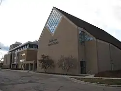The church's first services in English started in 1893, on a bi-weekly basis.[1][7] The 6th pastor, Olof Bodien, came in 1893 and pastored until 1912. During that time the church suffered a fire (December 3, 1893) and a tornado (August 1904).[13] By this time a number of notable Swedish Baptists were members of the church.[14][15] The church had two pastors from 1912 to 1918, when the eighth pastor, Eric Carlson, arrived. Membership rose to 834, and language tension grew during that time between old (Swedish) and young (English). The ninth pastor, Anton Sjolund, came in 1928, and membership reached 1,204. Services in Swedish continued until the mid-1930,[1][7] but on January 1, 1936, the church voted to move all services to English, except for one Swedish Sunday School class.[1] Nine years later, on April 13, 1945, First Swedish Baptist voted to change its name to Bethlehem Baptist Church (the same year that the Swedish Baptist General Conference in America dropped Swedish from its name).[4][1][6][16]