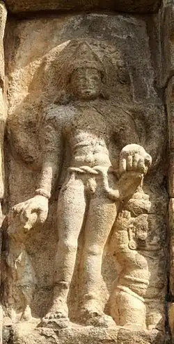 Images of Bhikshatana are found throughout Shaiva temples of South India,[27] but are almost unknown in Northern India.[42] Sculpted in stone adorning the temple walls of every other South Indian temple, images of Bhikshatana are also cast in bronze as processional icons.[29] In South Indian temples, Bhikshatana is prescribed to be enshrined as an avarana-devata (a deity depicted on the circumambulatory path encircling the central shrine).[43] Similarly in Orissan temples, Bhikshatana may be worshipped and depicted as parshva-devata (an attendant deity) or avarana-devata.[30]