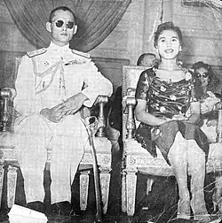 Other disused ceremonies from the classical period of the Chakri Dynasty, such as the royally patronised ploughing ceremony (Thai: พิธีพืชมงคล), were also revived.[49] Bhumibol's birthday (5 December) was declared the national day, replacing the previous national day, the anniversary of the Siamese revolution of 1932 (24 June).[50] Upon Sarit's death on 8 December 1963, an unprecedented 21 days of mourning were declared in the palace. A royal five-tier umbrella shaded his body while it lay in state. Long-time royal adviser Phraya Srivisaravacha later noted that no Prime Minister ever had such an intimate relationship with Bhumibol as Sarit.[51]