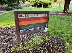 The park was named for Werner H. "Bhy" Kracke, who deeded the property to the city shortly after his death in 1971, along with $20,000 to develop it.[3][4] It was designed by landscape architect Roy Lehner to center around a winding trail between two levels—the viewpoint at the top and other amenities at the bottom.[5] Bhy Kracke Park has azaleas, magnolias, and rhododendrons. It has been described as "one of the best hidden parks" in the city.[6] Bhy Kracke has been considered for an off-leash dog park.[7]