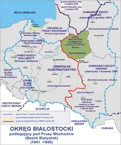 Bialystok District (German: Bezirk Bialystok)[1] was an administrative unit of Nazi Germany created during the World War II invasion of the Soviet Union. It was to the south-east of East Prussia, in present-day northeastern Poland as well as in smaller sections of adjacent present-day Belarus and Lithuania.[2] It was sometimes also referred to by the designation South East Prussia (German: Südostpreußen - see the map below) along with the Regierungsbezirk Zichenau, although in contrast to the latter, it was not incorporated into, but merely attached to East Prussia.