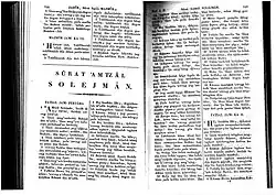 Shellabear's work was aided by Bishop Hose as well as Muhammad Ibrahim Munsyi, the son of Munshi Abdullah who also served as a scribe in the court of the Sultan of Johore.[22] In 1904, the translation of the New Testament was completed and by 1909 the translation of the Old Testament was also complete. Both were published in a single volume in Jawi in 1912.