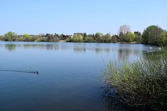 Biesdorfer Baggersee lies in a largely built-up area. A large filter system for rainwater is located a few meters west of its bank.[1] A 1,400 m (4,600 ft) long path runs around the quarry pond, which has several access points to the lake. The shore is overgrown with reeds, trees, and other vegetation on most parts of the lake. Only in the north is the shore area protected from entering by a fence. In the south of the lake, there are two separate sandy beaches, which are not approved for swimming. Several wooden loungers were installed at the lake and a volleyball court was created. The species of fish commonly found in the lake are carp, pike and roach.