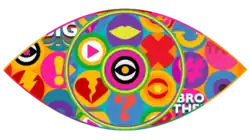 During the 20-second teaser aired in August 2022, it depicted numerous ITV2 logos forming into the shape of a Big Brother eye. However, the host reveal trailer and the official social media accounts feature the same shaped eye with the ITV2 colour scheme of purple.[73][74] In July 2023, the official eye logo for the series was revealed in the ad break during the final of the tenth series of Love Island.[48][75] The eye features multi-coloured icons with various symbols, and the words "Big Brother", it also includes a smaller eye in the centre.[76][77]
