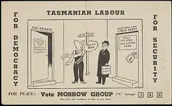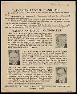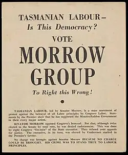 Morrow and the two other candidates on the Tasmanian Labour Group ticket campaigned on the basis of restoring the ALP's "socialist principles" and defeating "bureaucratic influences" that had made the ALP undemocratic. They initially planned to run a full slate of candidates at the 1955 Tasmanian state election.[16][17] The group polled less than six percent of the vote at the Senate election and soon disbanded,[14] with Morrow making no attempts to resume his parliamentary career.[1]