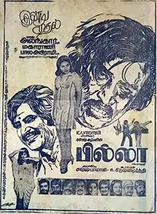 Billa is a 1980 Indian Tamil-language action thriller film directed by R. Krishnamoorthy and produced by Suresh Balaje. The film stars Rajinikanth, Sripriya and Balaji. It is a remake of Don, a 1978 Hindi film written by Salim–Javed and starring Amitabh Bachchan. The film revolves around Billa, a powerful ganglord who is fatally wounded during an encounter with the police. Wanting to uncover Billa's accomplices, DSP Alexander trains a lookalike simpleton Rajappa to pose as Billa and infiltrate the gang. The rest of the film deals with how Rajappa learns more about Billa's gang, and tries to get all of them arrested.
