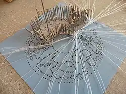 Tradition says that Binche lace was started in the 15th century by lacemakers that moved to Binche from Ghent with Mary of Burgundy, however there is no proof for this legend.[2] However, Binche lace was being made by the end of the 16th century. In 1585, when the river Scheldt was closed to shipping, Binche did not suffer a decline in its lacemaking as did others up the river such as Antwerp lace. Binche lace was the subject of a royal edict in 1686, which implies that the lace must have been fairly important.[3]: 121–122 The heyday of Binche lace was in the 18th century, when it was popular in Parisian circles.[3]: 121–122 It began to die out at the end of the 18th century, and was not made much during or after the 19th century. In 1862 Victor Hugo mentioned Binche lace as the material of Cosette's wedding gown in Les Misérables, as he remembered it from his youth as being a lace of great beauty.[3]: 121–122 The quality of Binche lace declined at the end of the 18th century, with the lace becoming coarser and the patterns less detailed.[2] Originally Binche lace resembled Valenciennes lace.[4]