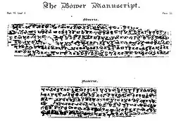 The Bower Manuscript is one of the oldest Sanskrit texts on birch bark in the Brāhmī script. It includes several texts covering subjects including a medical treatise and proverbs. It was discovered in Kucha (currently in Aksu Prefecture in Xinjiang, China), an ancient Buddhist kingdom on the northern Silk Road, and is estimated to be from around 450 CE.[12]