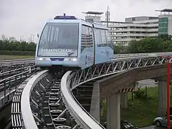 Birmingham Airport was once home to the world's first commercial maglev system in the form of a low-speed maglev shuttle that ran along a 620-metre line between the terminal and the nearby Birmingham International railway station.[15] Following a year of testing and trial use, the Birmingham Airport Maglev was opened to great fanfare during April 1984.[16] However, during 1995, the Maglev rail link was discontinued after 11 years; the closure has been attributed to the system's unreliability, it having suffered from frequent breakdowns. The original guideway lay dormant but intact for a time, while proposals for its restoration or adaption for other uses were considered.[17] In 2003, a replacement cable-hauled system, the Air-Rail Link Cable Liner people mover, was opened, which reused the track and much of the existing infrastructure.[18][19]