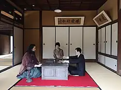 The Miyazaki family, whose distant ancestors are said to include Sugawara no Michizane, settled in Arao during the early Edo period. The family's origin is considered to have begun when the first-generation patriarch, Masayuki, married the daughter of Furusawa Yazaemon, the head of the Arao village.[17] In 1667, after being appointed as a gōshi (lowest rank on the samurai hierarchy) for the Higo Province's Kumamoto Domain, he became responsible for tasks such as the inspection of the Shimabara Domain and collecting intel on the Hizen Province (located in modern-day Saga and Nagasaki prefectures). The family continued as hereditary gōshi in the Tamana District until the 8th patriarch Miyazaki Masaaki. By the time of 9th patriarch, Chōzō, the father of the Miyazaki brothers, the family were prominent landlords in Arao, owning the area from the Arao Tidal Flats to the area where the Greenland amusement park stands today.[17][6] Chōzō valued education and excelled in the martial art Niten Ichi-ryū. As a landlord, he was known to treat people equally regardless of social class. This was an exceedingly rare attitude in Edo Japan. The revolutionary spirit of the Miyazaki brothers has been suggested to come from their father's egalitarian views.[17]