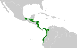 The black-cheeked woodpecker is found from Veracruz and Chiapas in southern Mexico south on the Caribbean slope into Costa Rica and from there on both slopes in Panama through western Colombia and western Ecuador slightly into Peru.[6][7][4]