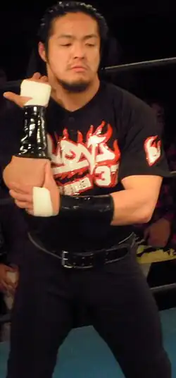 In April 1999, Yamada joined the Osaka Pro Wrestling promotion, where he began wrestling under a mask as Black Buffalo, a character inspired by the Osaka Kintetsu Buffaloes baseball team.[3] He made his debut for the promotion at its first event on April 29, where he, Dick Togo and Violencia, forming the villainous alliance Legion of Violence (LOV), were defeated in a six-man tag team main event by Masato Yakushiji, Naohiro Hoshikawa and Super Delfin.[18] Buffalo kept teaming with Togo for the rest of the year.[18][19] On November 21, Buffalo won his first title in Osaka Pro, when he defeated Super Delfin for the UWF Super Welterweight Championship, only to lose it back to him seven days later.[19] In early 2000, LOV was joined by Daio Quallt and Policeme~n, replacing Violencia.[20] On May 1, Buffalo and Togo defeated Super Delfin and Super Demekin in the finals to win the 1st Anniversary Tag Tournament.[21] In September, Buffalo took part in the inaugural Tenno-zan tournament, where he made it to the semifinals, before being eliminated by Super Delfin.[22] After Dick Togo left Osaka Pro at the end of 2000, LOV was disbanded and replaced by the new group, FLUXxx, as a member of which Buffalo formed a new tag team named Infinity with Tsubasa.[23] After reaching the semifinals of the 2001 Osaka Tag Festival,[24] Buffalo and Tsubasa defeated Super Delfin and Takehiro Murahama on July 21 to win the vacant Osaka Pro Wrestling Tag Team Championship.[25] They would lose the title to Murahama and Kaiju Zeta Mandora on August 24.[25] The following October's Tenno-zan saw a repeat of the previous year's tournament as Buffalo was eliminated in the semifinals by Super Delfin.[25] On January 27, 2002, Buffalo, Tsubasa and Gamma defeated Super Delfin, Super Demekin and Takehiro Murahama to win the Trios Cup Tournament.[26] On August 25, Buffalo and Tsubasa regained the Osaka Pro Wrestling Tag Team Championship by defeating the Kishiwada Gurentai (Big Boss MA-G-MA and Daio Quallt).[26] After a five-month reign, they would lose the title to Jyushin Thunder Liger and Takehiro Murahama on February 1, 2003.[27]