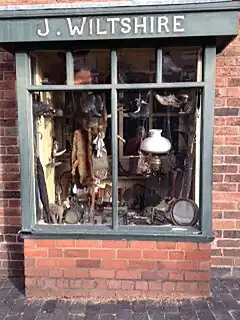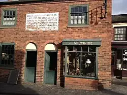 The pair of cottages from School Lane in Himley originally operated as a corner shop. The setting of the display was designed to represent a small scale business. The shop takes its name from a well known Black Country pawnbroker, Joseph Wiltshire, who owned shops in Great Bridge, Wolverhampton and Carter's Green in West Bromwich. The exhibition combines pawnbroking with retail, as did many pawnbroking businesses in the 19th century. In the museum's reconstruction the unredeemed goods and other stock are sold in the front room, while pawning of goods was done in the 'pledge room' at the back.[1]