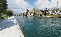 The Black Drin, or Black Drim (Albanian: Drini i Zi; Macedonian: Црн Дрим) is a river in North Macedonia and Albania. It flows out of Lake Ohrid in Struga, North Macedonia. It is 149 km (93 mi) long and its drainage basin is 3,504 km2 (1,353 sq mi). Its average discharge is 118 m3/s (4,200 cu ft/s).[2] After flowing through North Macedonia for 56 km (35 mi), the Black Drin crosses the border to Albania, west of Debar. It merges with the White Drin in Kukës to form the Drin, which flows into the Adriatic Sea. It drains most of the eastern border region of Albania.