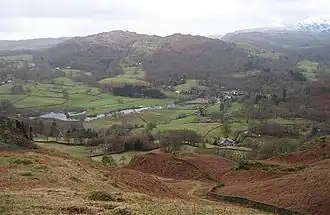 Black Fell is the high point in the hilly area bounded by Windermere, Langdale and Coniston. It occupies an area of around one mile by two, clad mainly in fell grass with many small outcrops of rock. Despite its modest altitude Alfred Wainwright accorded Black Fell a chapter in his Pictorial Guide to the Lakeland Fells, partly due to its excellence as a view point. It represents the perimeter of the Lakeland Fells proper in his opinion, the land to the south falling within his supplementary volume, The Outlying Fells of Lakeland. Later guidebook writers have also included Black Fell within their remit.[1][2]