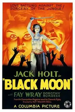 Black Moon is a 1934 American pre-Code horror film directed by Roy William Neill and starring Jack Holt, Fay Wray, and Dorothy Burgess.[1] It is based on a short story by Clements Ripley that first appeared in Hearst's International-Cosmopolitan. The film centers on a young woman who returns to the tropical island where her parents were murdered during a voodoo ritual with her daughter and nanny, only to become corrupted by the native's dark rituals.