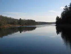 The Seneca, members of the Iroquois Confederacy, became inhabitants in the area of Black Moshannon Lake, which was a series of beaver ponds at the time. They and other tribes, including the Lenape, hunted, fished, and traded in the region.[4][9] The Great Shamokin Path, the major native east–west path connecting the Susquehanna and Allegheny River basins, crossed Black Moshannon Creek at a ford a few miles downstream from the park; however, no trails of the indigenous peoples are recorded as having passed through the park itself.[10] The park's 1-mile (1.6 km) Indian Trail for hiking and cross-country skiing recalls such native paths as it runs through an open forest of oak and pine trees, with occasional clearings and a grove of hawthorns.[11][12]