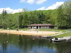 The sandy beach on Black Moshannon Lake is open from Memorial Day weekend through Labor Day weekend, and the beach bathhouse was built by the CCC.[37] Beginning in 2008, lifeguards will not be posted at the beach.[57]